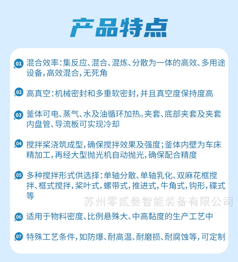 1、混合效率:集反应、混合、混炼、分散为一体的高效、多用途设备,高效混合,零死角;