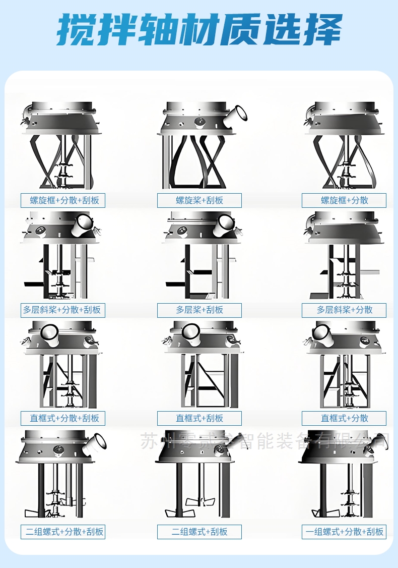 5、多种搅拌形式供选择:单轴分散、单轴乳化、双麻花框搅拌、框式搅拌,桨叶式,螺带式,推进式,牛角 式,钩形,碟式等;